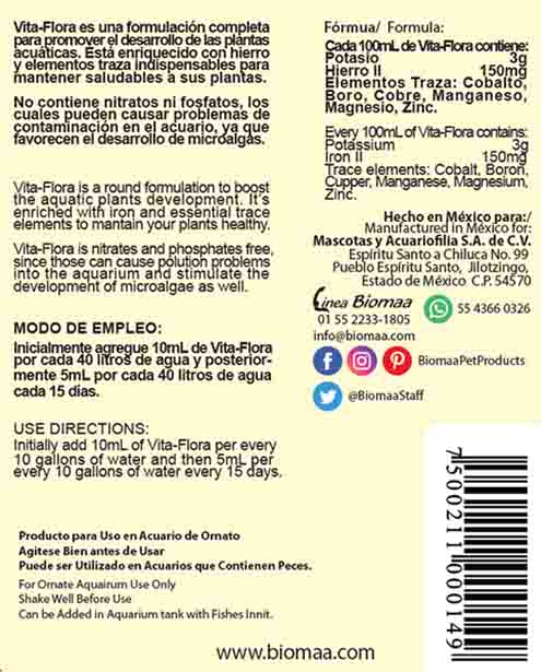 Vita Flora is a liquid fertilizer for aquatic plants, specially designed for use in tropical aquariums. It contains all the macro and micronutrients not commonly found in aquariums, such as potassium, iron, boron, magnesium, among others.
