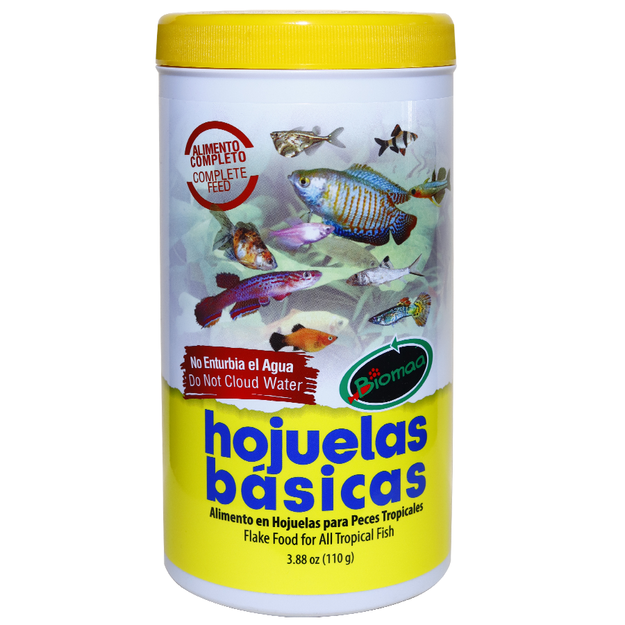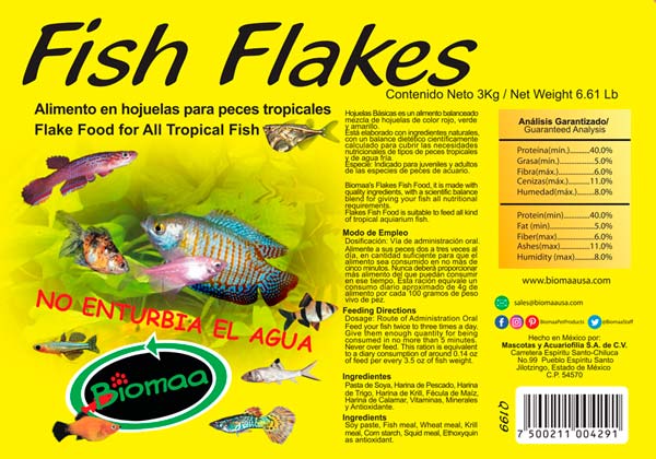 It is made with natural ingredients of the best quality, among them fish, shrimp, meat and squid flours, all excellent sources of animal protein; torula yeast and spirulina as sources of microbial protein, and soy flour as a source of vegetable protein. This makes Biomaa Fish Flakes an exceptional food with a minimum of 42% protein content. It also has the essential vitamins and minerals in quality and quantity to guarantee a healthy and rapid development of your fish.