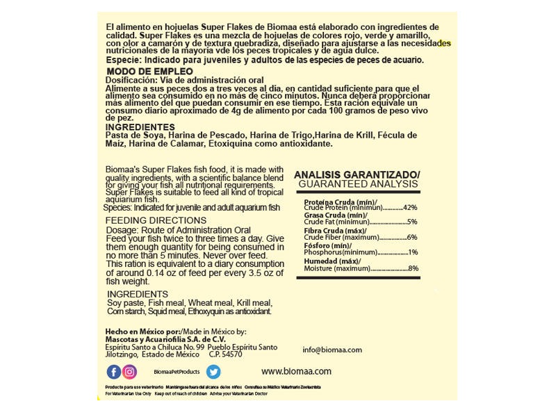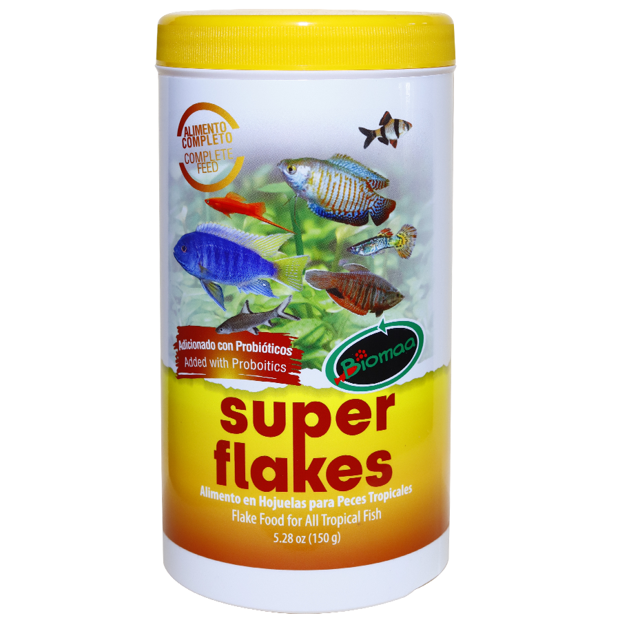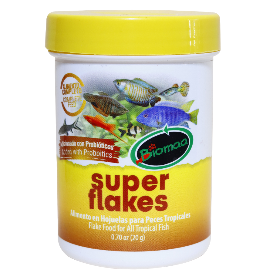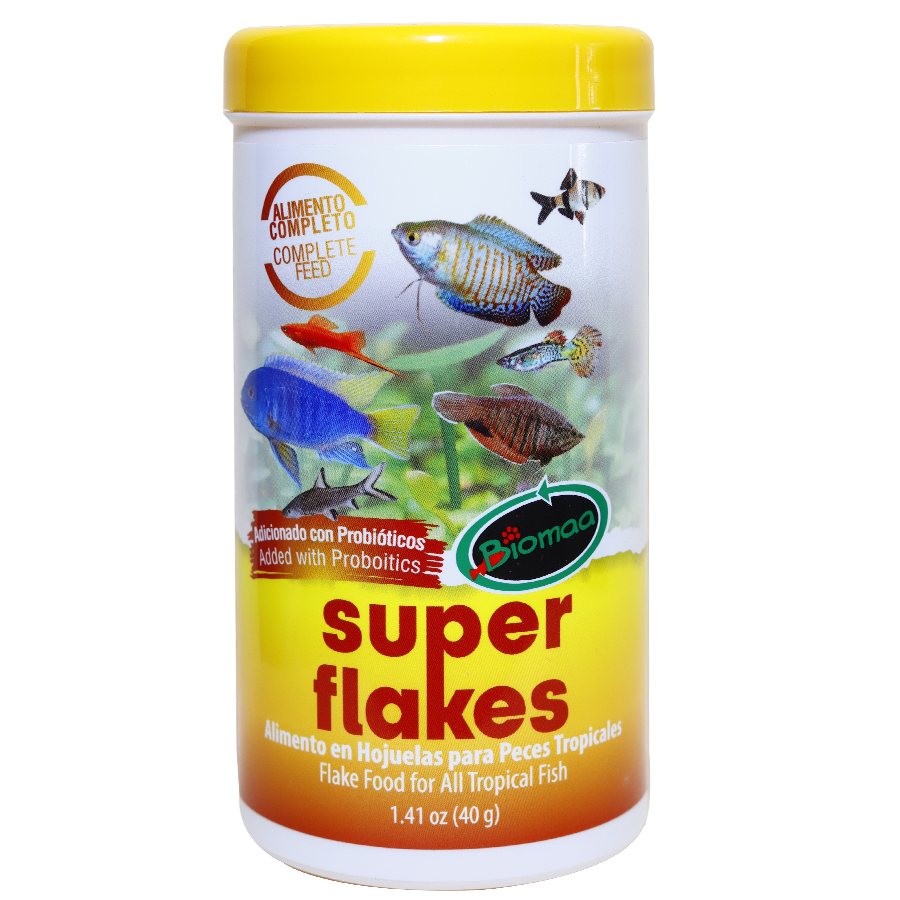 Super Flakes LabelFlake Food for Tropical Fish Biomaa's Super Flakes is a high quality fish food. It is made with natural ingredients, with a scientific balance blend for giving your fish all nutritional requierements. Super Flakes is suitable to feed all kind of tropical fish. FEEDING DIRECTIONS Route of Administration: Oral. INGREDIENTS Soybean Paste, Fish Meal, Wheat Flour, Krill Flour, Corn Starch, Squid Meal, Vitamins, Minerals & Antioxidant. Protein(min)................42% |