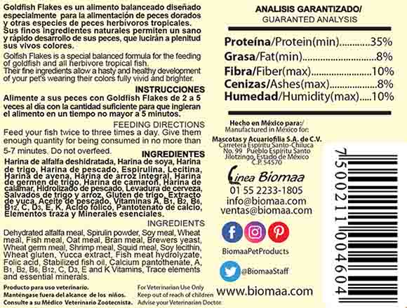 Goldfish Flakes LabelFlake Food for Tropical Fish Goldfish Flakes is a special balanced formula for the feeding of goldfish and all herbivore tropical fish. FEEDING DIRECTIONS Feed your fish twice a day. Give them enough quantity for being consumed in no more than 5-7 minutes. Do not overfeed. INGREDIENTS Dehydrated alfalfa meal, Spirulin powder, Soy meal, Wheat meal, Fish meal, Oat meal, Bran meal, Brewers yeast, Wheat germ meal, Shrimp meal, Squid meal, Soy lecithin, Wheat gluten, Yucca extract, Fish meal hydrolyzate, Folic Acid, Stabilized fish oil, Calcium pantothenate, A, B1, B2, B6, B12, C, D3, E and K Vitamins, Trace elements and essencial minerals. Protein(min)................35% |