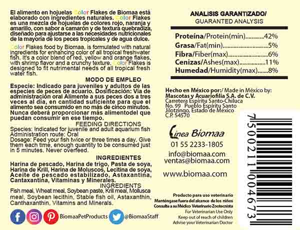 Color Flakes LabelFlake Food for Tropical Fish Color Flakes food by Biomaa, is formulated with natural ingredients for enhancing color of all tropical freshwater fish. It's a color blend of red, yellow and orange flakes, with shrimp flavor and a crunchy texture. Color Flakes is designed to fit nutrimental needs of all tropical freshwater fish. FEEDING DIRECTIONS Species: Indicated for juvenile and adult aquarium fish. INGREDIENTS Fish Meal, Wheat Flour, Soybean paste, Krill meal, Mollusca meal, Soybean lecithin, Stable fish oil, Astaxanthin, Canthaxanthin, Vitamins and Minerals. Protein(min)................42% |