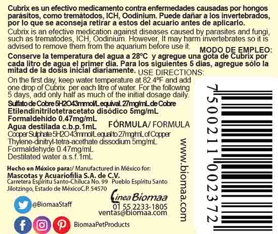 Cubrix can harm invertebrates, so it is advisable to remove these from the aquarium before applying it. Cubrix is a stabilized and partially chelated solution of 1.4% soluble copper salts, with small amounts of added formaldehyde. Cubrix differs from traditional Copper Sulfate solutions, which present self- reduction in more or less short periods, since the chelating agents it contains give it great stability both for the application of this medicine in aquariums, even in hard water; on the other hand, prolonging the useful life of the product in warehouse. Product stability is guaranteed for a minimum term of 2 years.