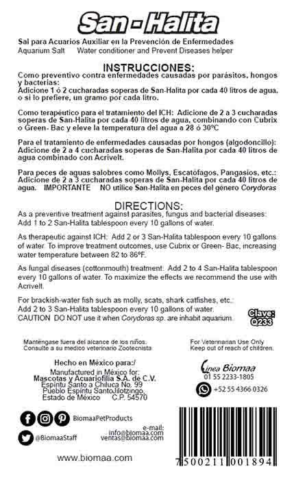 San-Halita should be used with caution since not all fish species tolerate salt dissolved in the water, as is the case of the Corydoras and Brochis genera, to mention some of the most common.