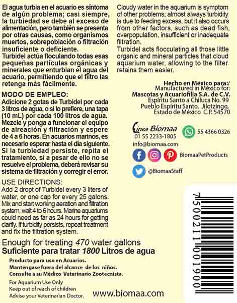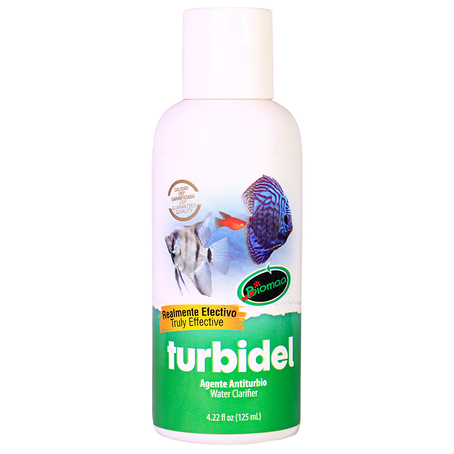 Turbidel acts on all these tiny particles by flocculating them; that is, it manages to join several of them with the purpose of forming increasingly larger particles so that ordinary filters are able to retain them. Turbidel also works just as effectively when the turbidity of the water is caused by very fine mineral particles from the sand or gravel at the bottom of the aquarium