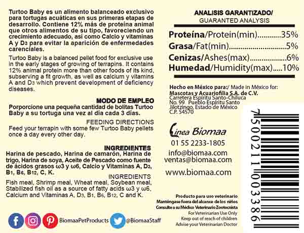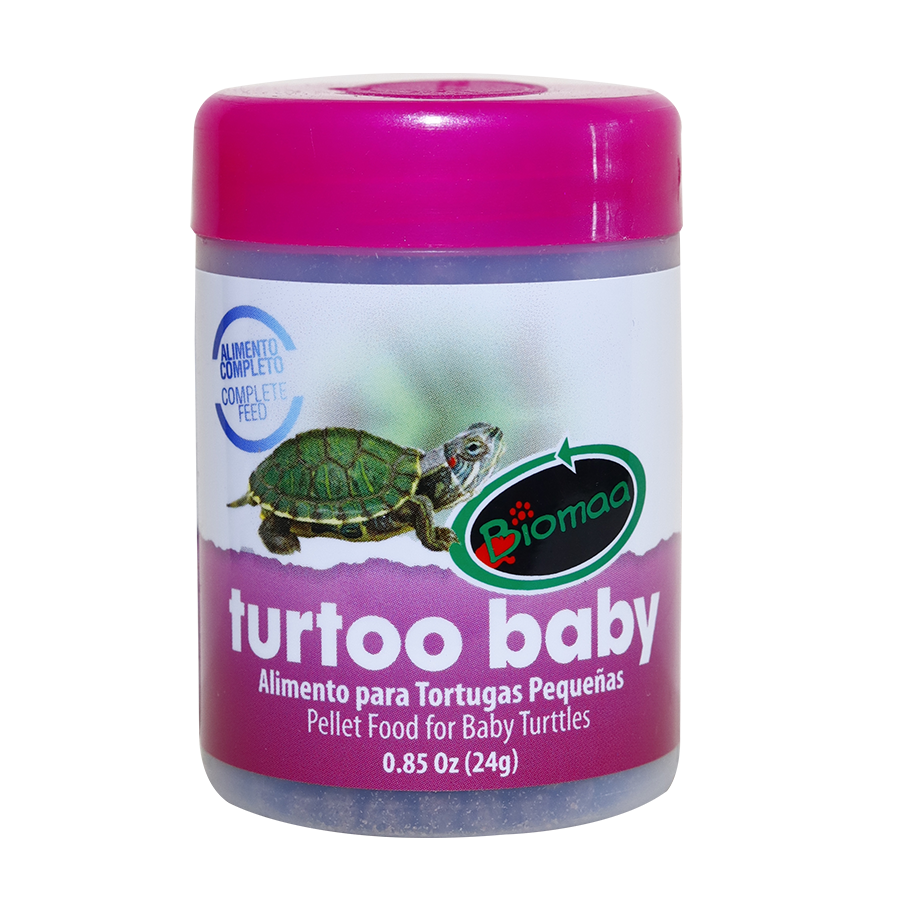 Turtoo Baby is a balanced food specially formulated to meet the requirements of turtles in their early stages of development. It contains 12% more protein of animal origin than other foods of its kind, which favors proper growth and resistance to the most common diseases. It special emphasis on the quality and quantity of the protein used as well as other essential nutrients, including calcium and vitamins A and D3.