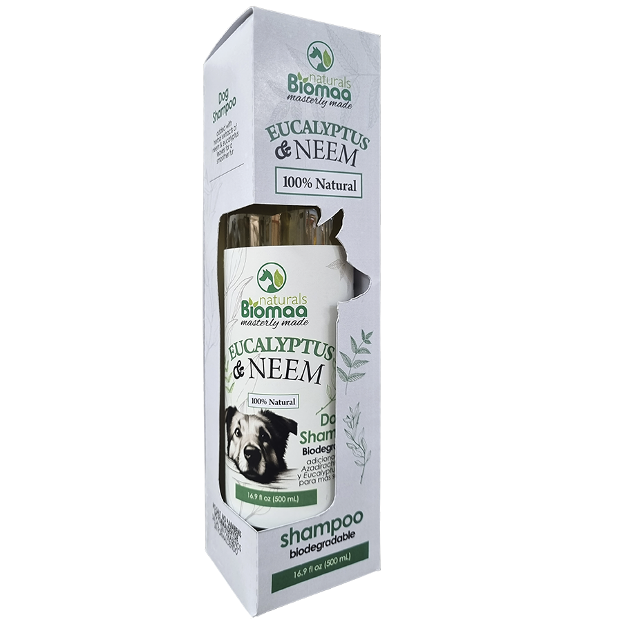 El Shampoo Eucalyptus&Neem de Biomaa Naturals, combina los extractos orgánicos herbales de estas dos plantas milenarias, por un lado las hojas de neem y por otro el aceite esencial de eucalipto, ampliamente reconocidos como remedios herbales. Los principios herbales de eucalipto & neem actúan de forma sinérgica para lograr que tu perro se beneficie con una piel y pelo sanos de forma natural.